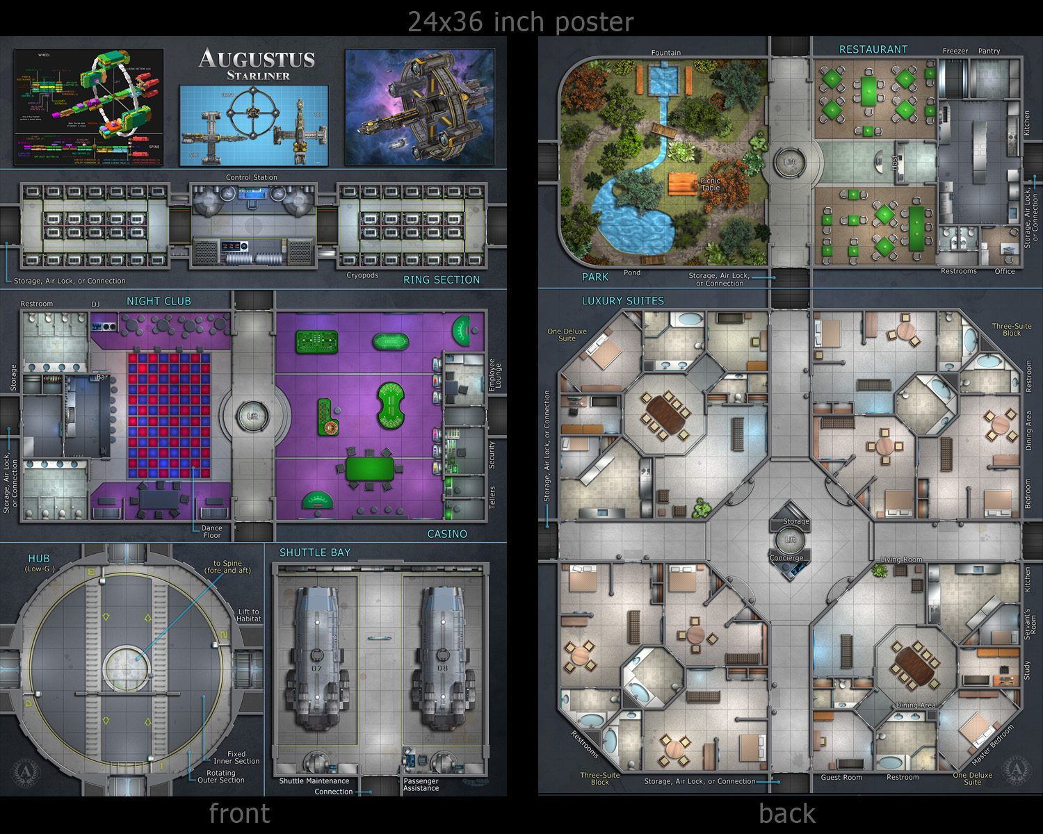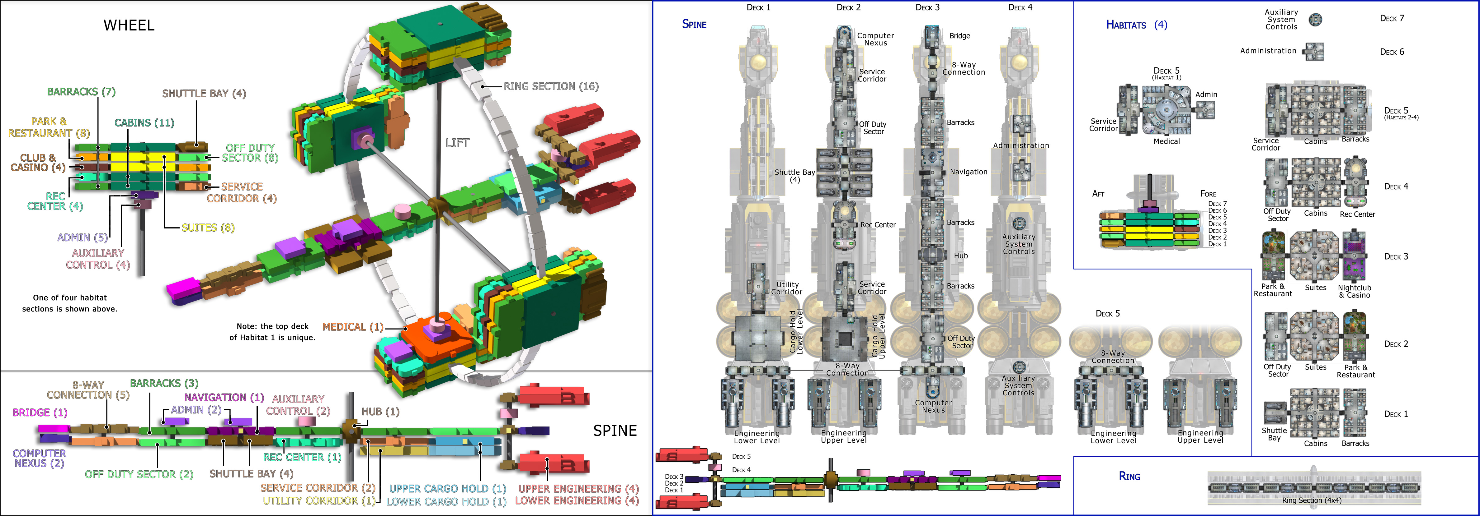 Augustus consists of a central spine, nearly 1000 feet long, and a rotating wheel with four similar habitats, each five decks high. The spine holds the crew, cargo, and engine areas. The habitats contain passenger accommodations and entertainment, with the arcs between housing hundreds of cryogenic pods. Augustus carries 200 crew and has room for more than 1200 passengers plus another 600 in cold sleep. Sixteen extended Brahma-class shuttles are carried to ferry passengers and crew to nearby planets or stations.