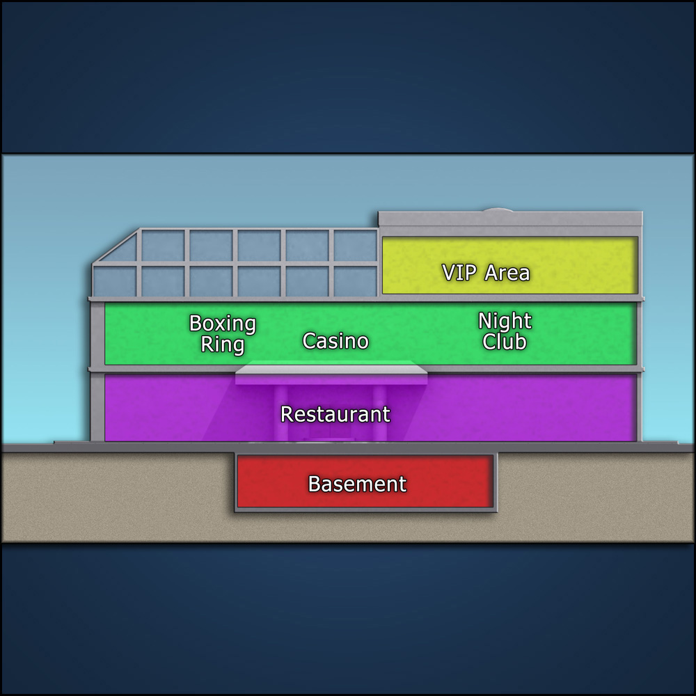 Ground level features a spacious restaurant with private booths, a stage, kitchen, and some gaming tables. The second floor is the main casino area and also holds a boxing ring and nightclub complete with a DJ and dance floor. Overlooking all of this are VIP booths on the upper level - which also holds the high-rollers area and the boss's office.