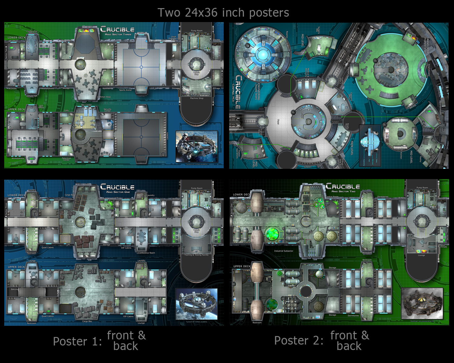Because of its size it takes two 24x36 inch posters (four sides) to map out the complete facility, so this is a two poster set (two different posters). The front and back of both posters are displayed above. All of my maps are at 1 inch = 5 feet scale with a 1 inch grid built into the floor.