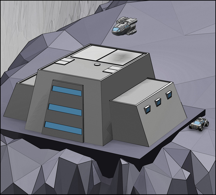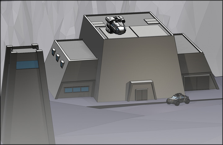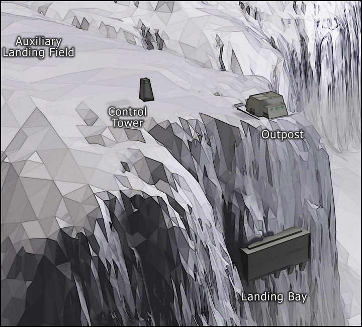 The outpost itself is a self-sustaining, fortified block-like structure with three levels above ground. Common areas are on the ground floor, living quarters in the middle, and the command center at the top. Far below the surface is a research lab and additional housing for guests or prisoners. A large underground landing bay is also at this level, exiting in the middle of the cliff face. Parking for larger ships is available on the nearby plateau overseen by a dedicated control and communications tower.