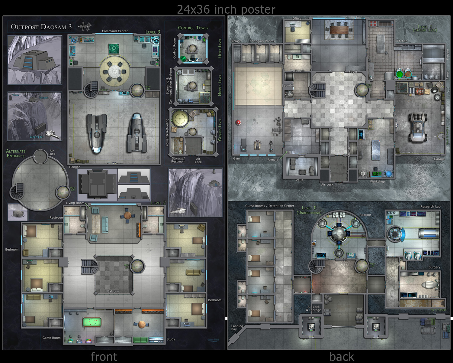 An "alternate entrance" map is provided so that the underground lab can be used without an inhabited outpost overhead if desired.