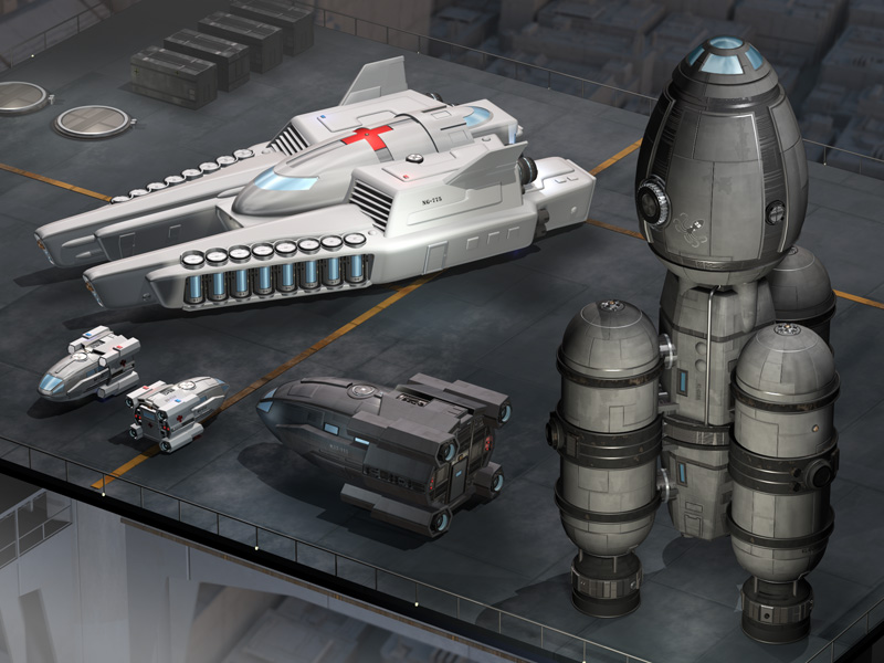 casualties for future treatment. She carries a pair of ambulance shuttles and has bunks for up to eight crew.