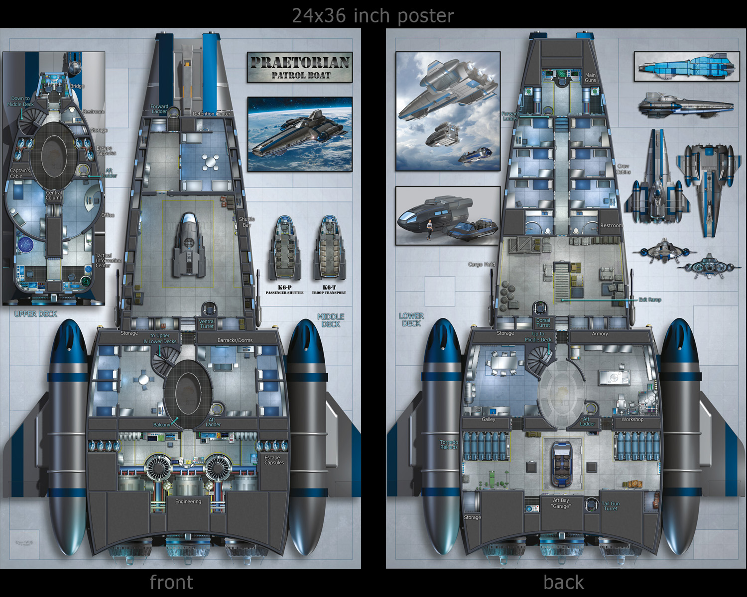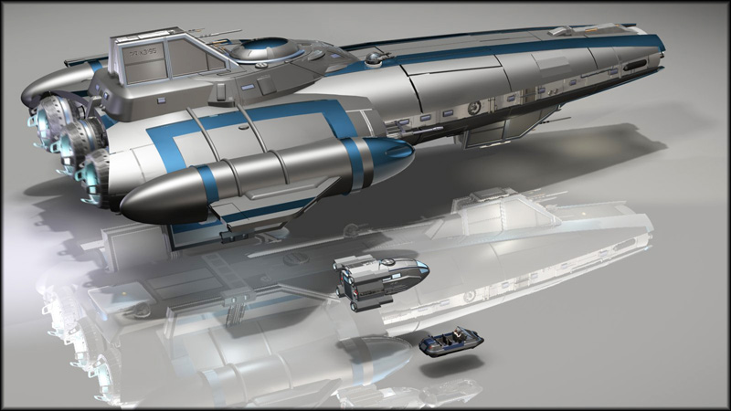Praetorian has a small cargo hold, a shuttle bay, and an aft “garage” area. She comes standard with a K-6 passenger shuttle in the bay and a Stratos 7000 air car in the garage. Other amenities include a brig, tactical information center, and techshop with a medical table. Weapons range from a trio of turrets, two large front-mounted guns, to side-mounted torpedo launchers. All told, this is a formidable ship well suited to extended patrol and policing duties in the hands of the authorities – or as a ship of exploration, adventure, or piracy in the hands of civilians