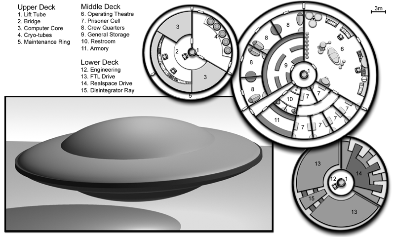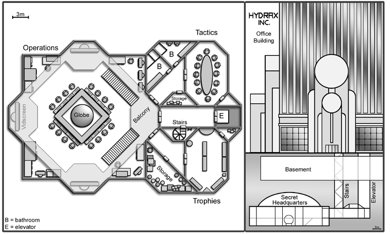 The locations represented in the first row are a flying saucer, a nightclub, and a secret underground headquarters.