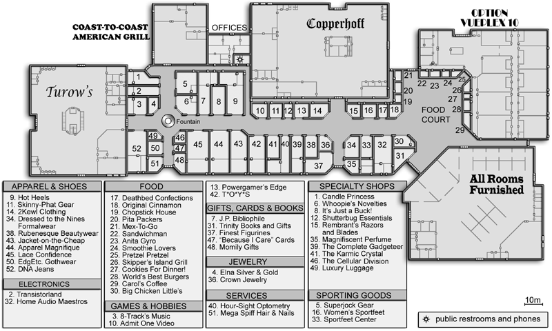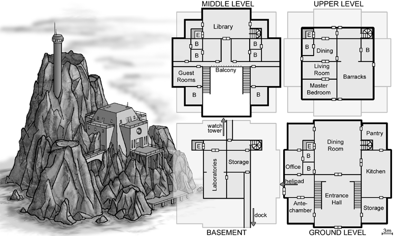 The second row depicts an island stronghold, a convenience store, and a mall.