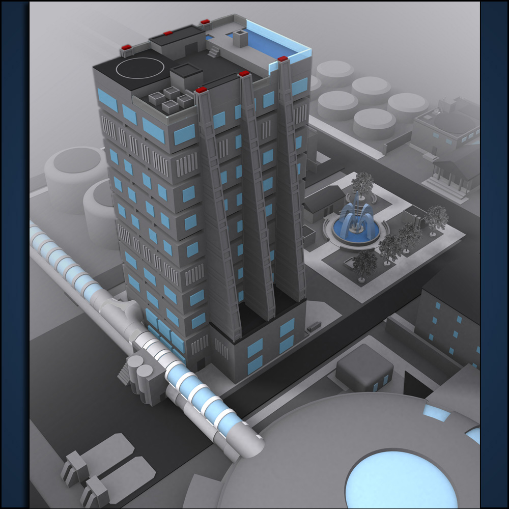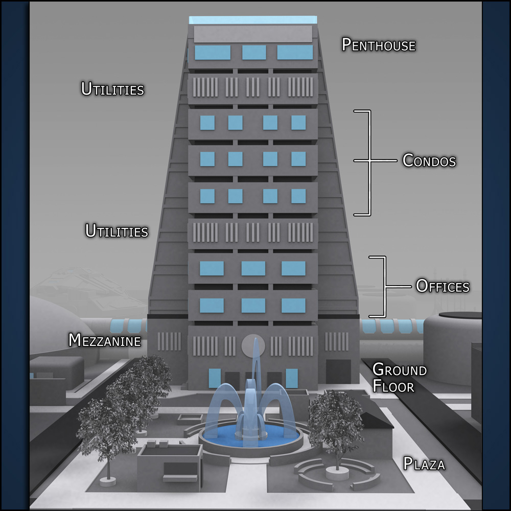 The fifth offering in the 0hr Sci-Fi Settings product line presents two posters that layout a high-rise with office, condo, and penthouse levels.